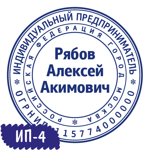 У нас Вы можете заказать Простую печать Индивидуального предпринимателя ИП-04. Необходимые данные для ИП: ОГРНИП, ФИО, ИНН.