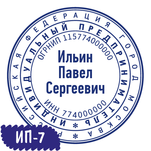 У нас Вы можете заказать Простую печать Индивидуального предпринимателя ИП-07. Необходимые данные для ИП: ОГРНИП, ФИО, ИНН.
