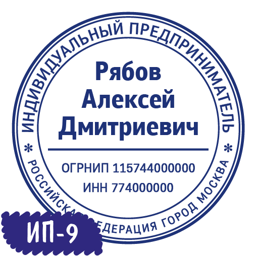 У нас Вы можете заказать Простую печать Индивидуального предпринимателя ИП-09. Необходимые данные для ИП: ОГРНИП, ФИО, ИНН.