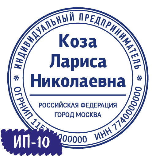 У нас Вы можете заказать Простую печать Индивидуального предпринимателя ИП-10. Необходимые данные для ИП: ОГРНИП, ФИО, ИНН.