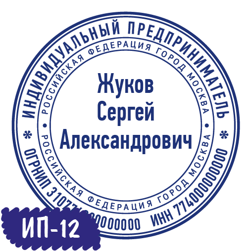 У нас Вы можете заказать Простую печать Индивидуального предпринимателя ИП-12. Необходимые данные для ИП: ОГРНИП, ФИО, ИНН.