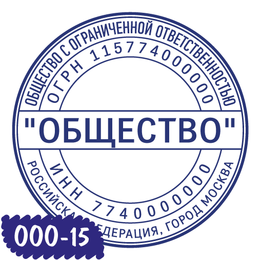 У нас Вы можете заказать Простую печать Общества с ограниченной ответственностью ООО-15. Необходимые данные для ООО, ЗАО, ОАО: Вид организационно правовой формы, Субъект регистрации, ОГРН, наименование (согласно Уставу), ИНН.